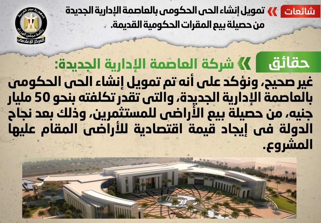تردد في بعض وسائل الإعلام والمواقع الإلكترونية وصفحات التواصل الاجتماعي أنباء بشأن تمويل إنشاء الحي الحكومي بالعاصمة الإدارية الجديدة من حصيلة بيع المقرات الحكومية القديمة، وقد قام المركز الإعلامي لمجلس الوزراء بالتواصل مع شركة العاصمة الإدارية الجديدة، والتي نفت تلك الأنباء، مُؤكدةً أنه لا صحة لتمويل إنشاء الحي الحكومي بالعاصمة الإدارية الجديدة من حصيلة بيع المقرات الحكومية القديمة، مُوضحةً أنه تم تمويل إنشاء الحي الحكومي بالعاصمة الإدارية الجديدة، والتي تقدر تكلفته بنحو 50 مليار جنيه، من حصيلة بيع الأراضي للمستثمرين، وذلك بعد نجاح الدولة في إيجاد قيمة اقتصادية للأراضي المقام عليها المشروع.